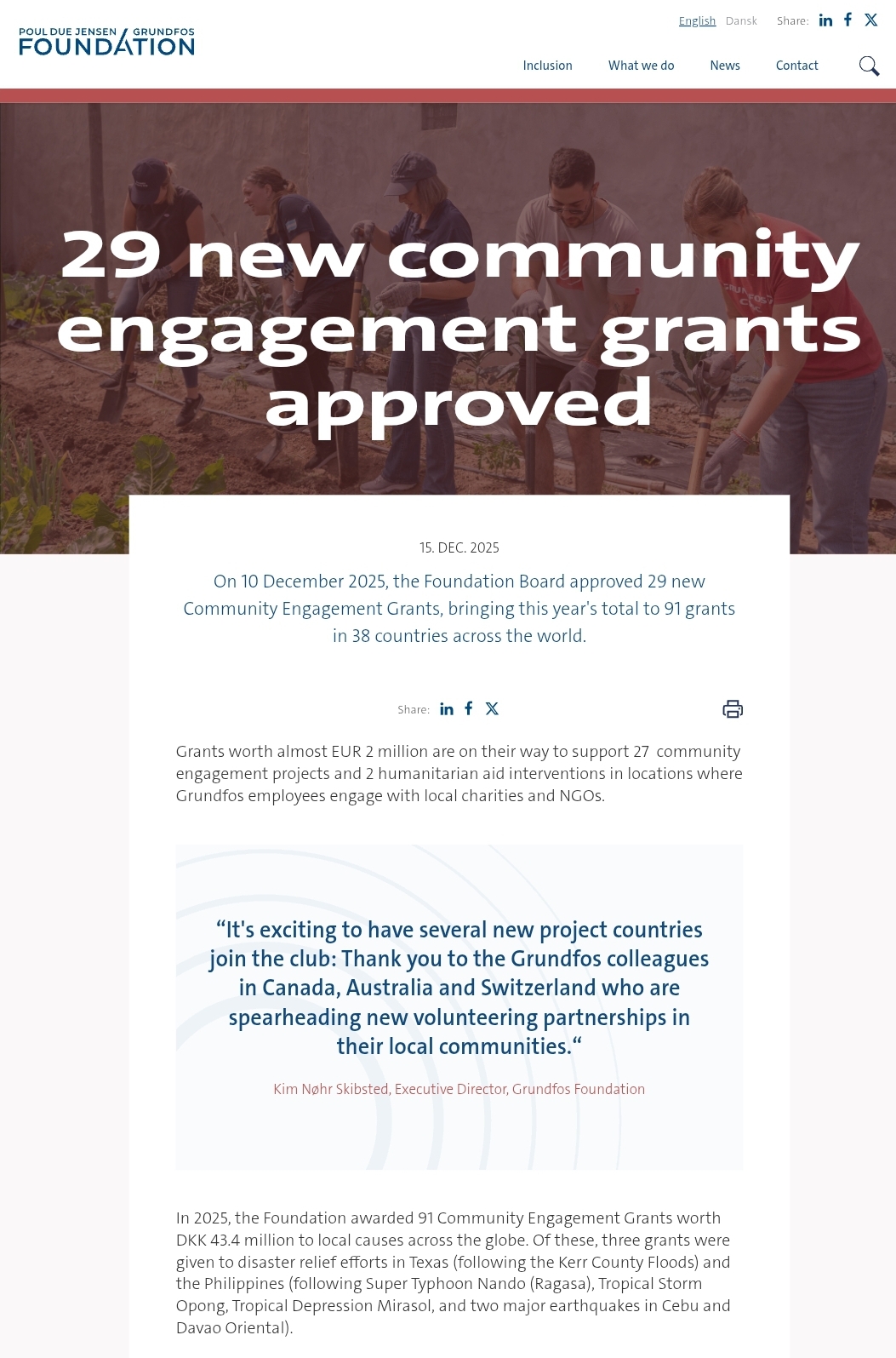 Jakarta — Yayasan Wafaa Indonesia Gemilang resmi terpilih sebagai salah satu penerima Community Engagement Grant dari Poul Due Jensen Foundation (PDJF). Lembaga ini merupakan sebuah yayasan filantropi internasional yang berafiliasi dengan perusahaan global Grundfos, produsen pompa terbesar di dunia yang berbasis di Denmark. Pengumuman tersebut disampaikan secara terbuka dalam publikasi resmi yayasan tersebut terkait persetujuan 29 Community Engagement Grants terbaru. Grant ini merupakan bagian dari program dukungan Poul Due Jensen Foundation terhadap inisiatif pemberdayaan masyarakat yang dijalankan oleh organisasi mitra di berbagai negara. Program tersebut menekankan keterlibatan komunitas, keberlanjutan, serta penciptaan dampak sosial jangka panjang. Yayasan Wafaa Indonesia Gemilang memperoleh […]